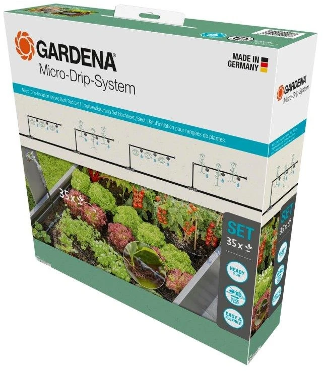 The set can be flexibly extended with the GARDENA Micro-Drip components. In combination with, for example, the Water Control Flex (art. no. 1890-20), even more convenient and time-saving automatic irrigation is made possible. Ready-2-UseThe set is ready for immediate use as it contains all the necessary components for water-saving irrigation of up to 35 garden plants. Even and reliable irrigation of garden beds