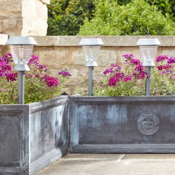 Set of 4 super-bright 10 Lumen solar stake lights with cool white LEDs. Ideal for highlighting the edges of borders, paths and driveways. The lights will auto-illuminate for up to 8 hours per night, depending on charge. The smart solar adjusts the brightness of the light according to the amount of daylight received, saving battery life and ensuring year-round operation.